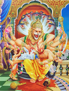 There was Sri Hari, in the form of Narasimha. He had the head of a lion and the body of a man. (Nara = Man : Simham = Lion). The eyes of this terrible figure were dazzling and they looked like molten gold. The hair on the head and the moustache and the beard stood straight and erect. The sharp and pointed jaws chattered harshly; the tongue quivered like a sword and was sharp as a dagger. His eyebrows were close knit. The ears were raised and stood erect. The mouth gaped like a mountain cave. The two nostrils looked like wells turned upside down. The body was huge and mountain-like. It seemed to touch the skies and to stop the very clouds. It had countless arms. The body was covered with a white substance like silver. The very sight of the sharp claws made one tremble.